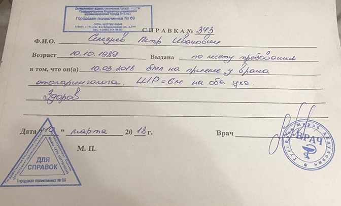 Получить бумагу возможно по мере взятия талончика, выжидания положенного срока, посещения отоларинголога государственной, частной поликлиники. Порой документ нужен исключительно для улаживания бюрократических моментов, пациент абсолютно здоров. В подобной ситуации рекомендуем обратиться в центр «5й кабинет»: специалисты подскажут, где купить заключение в день обращения с доставкой. Цена услуги низкая, данные заполняются по образцу, установленному действующим законодательством. Менеджеры подберут современную, лицензированную клинику, наладят взаимодействие с врачом, избавят от забот, связанных с изготовлением любой медицинской документации!