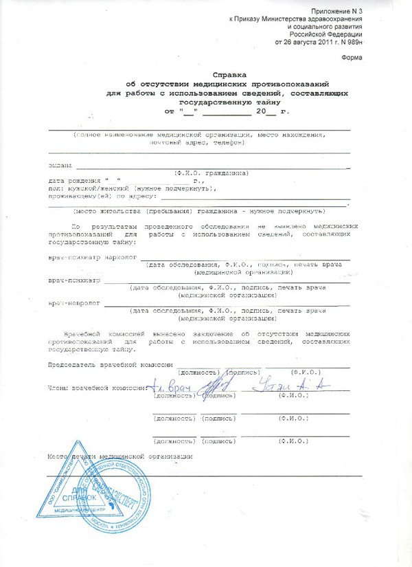 Она требуется для получения допуска к сведениям, составляющим государственную тайну. Документ подтверждает, что у гражданина нет медицинских противопоказаний, которые могут препятствовать работе с секретной информацией.